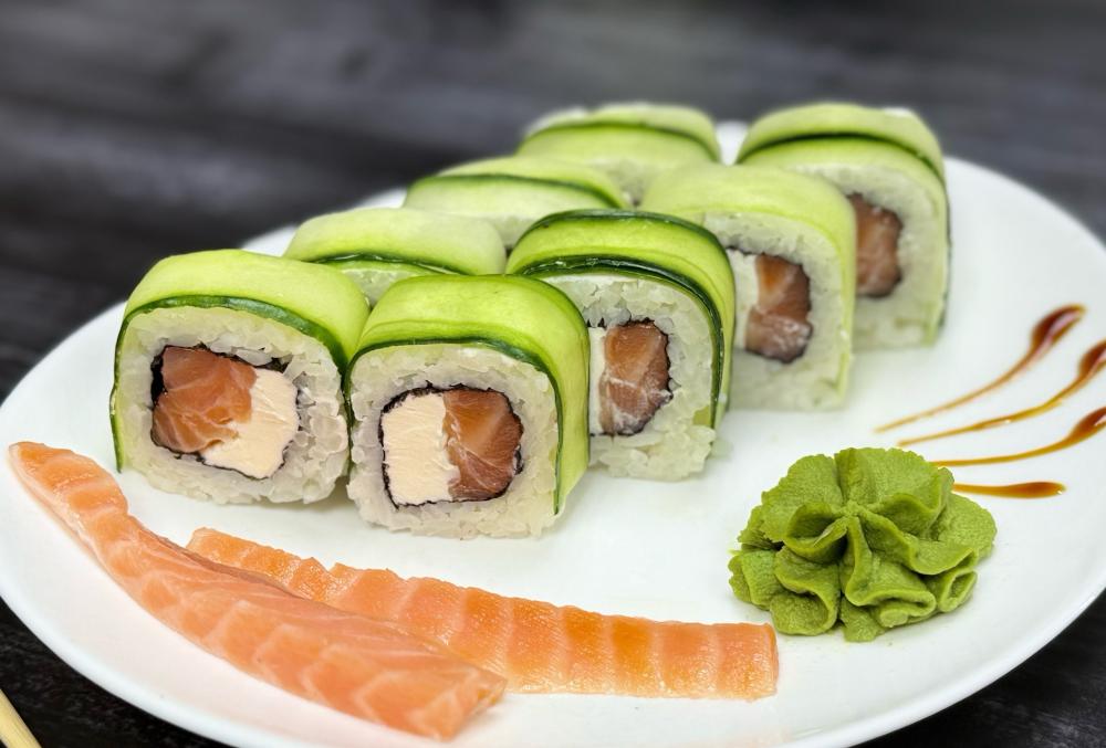 Классический ролл в свежей интерпретации. Нежный творожный сыр, слайсы огурца и лосось в гармонии с рисом и нори.