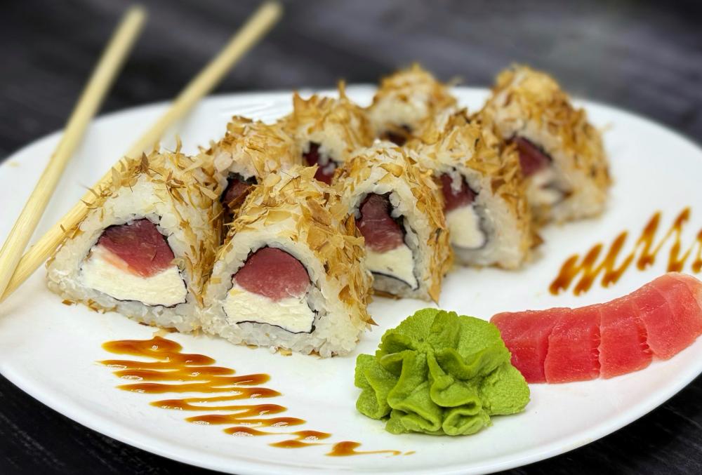 Насыщенный вкус тунца в двух текстурах: нежное филе внутри и хрустящая стружка снаружи. Сливочный сыр объединяет все компоненты.