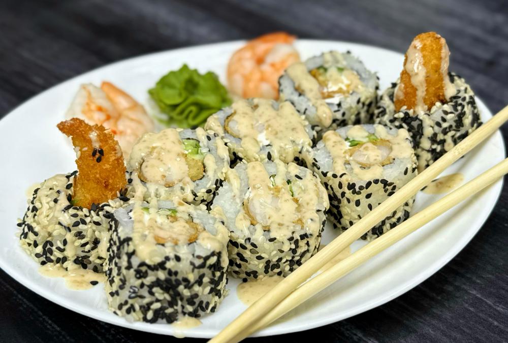 Хрустящая креветка темпура, свежий огурец и нежный сыр в облаке орехового соуса.