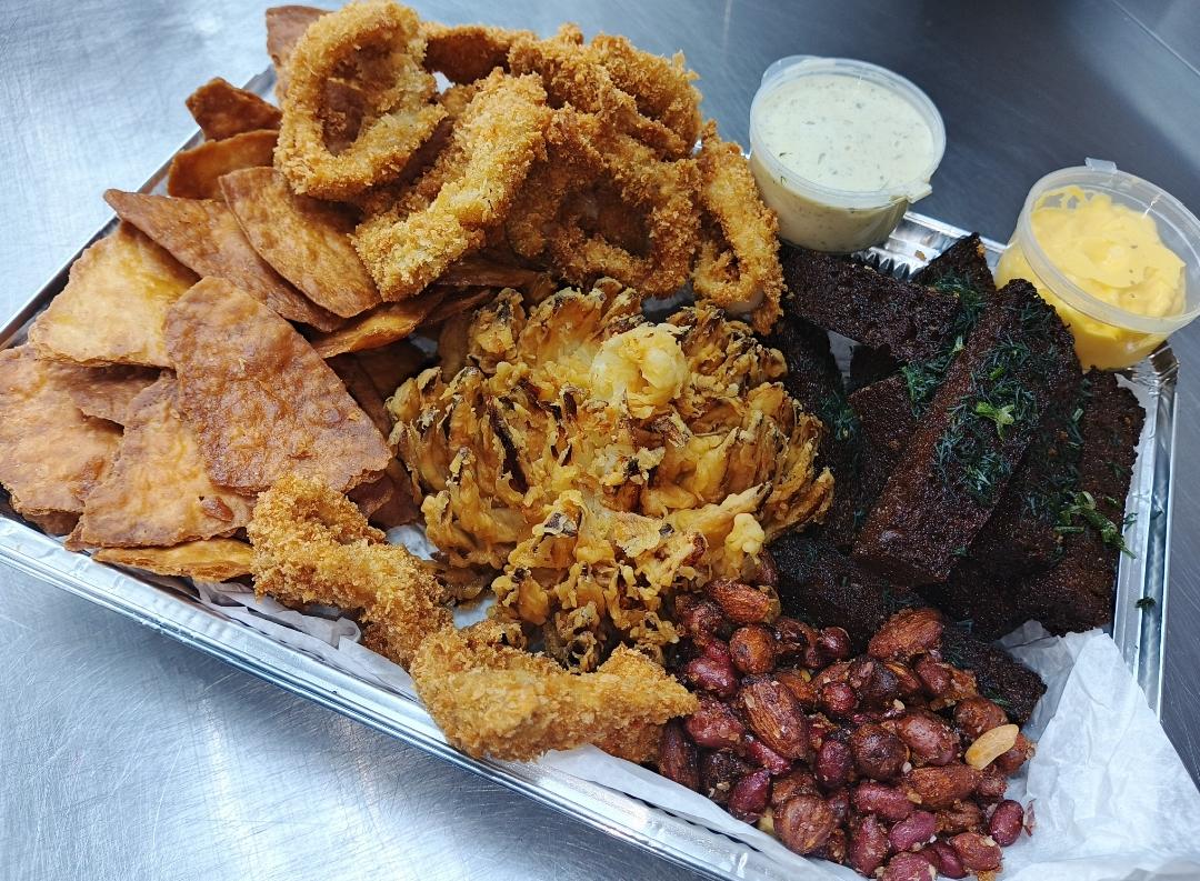 Идеальный дуэт к холодному пиву! Хрустящие луковые кольца, золотистые начос, нежные кольца кальмара, острые гарлики и сладкие глазированные орехи. Дополнены двумя соусами: тар-таром и сырным.