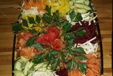Нежный отварной говяжий язык, нарезанный тонкими ломтиками, подается с хрустящим свежим перцем и луком. Заправленный нашим фирменным соусом.