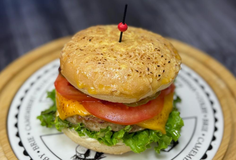 Сочная свиная котлета, расплавленный сыр чеддер, хрустящие маринованные огурчики, свежий салат и помидор под ароматной булкой собственного приготовления. Фирменный соус и барбекю дарят насыщенный вкус.